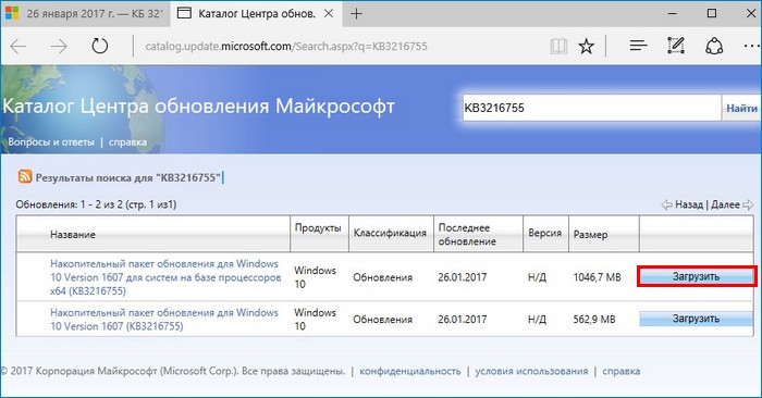 Переходим по ссылке: https://support.microsoft.com/ru-ru/help/4011347 и оказываемся на страничке ж урнала обновлений Windows 10 официального сайта Майкрософт и выбираем обновление KB3216755, идём в низ страницы