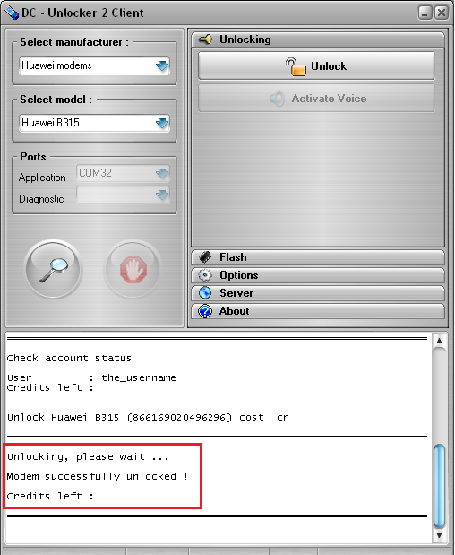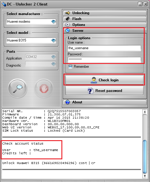- Open Server tab, enter your username and password that you received after credits purchase. Click «Check login». (you can buy credits here www.dc-unlocker.com/buy). If DC-Unlocker/Vygis/Rocker/Infinity dongle is connected, only click » Check login «