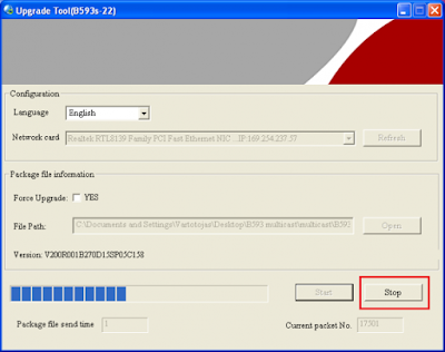 After a while indicator will turn into red, press «Stop» button on upgrade tool, disconnect LAN cable from PC
