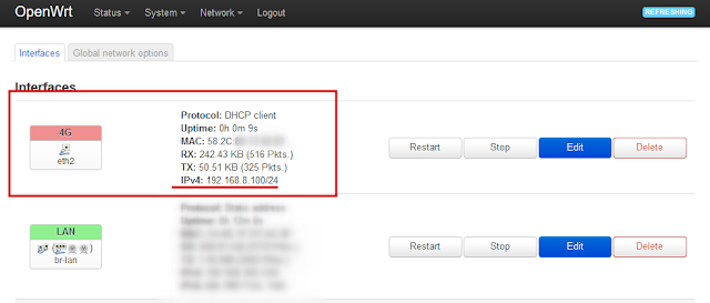 7. Если все сделано правильно, то на созданном интерфейсе 4G будет получен ip-адрес от модема, в примере 192.168.8.100, проверить работу Интернета.