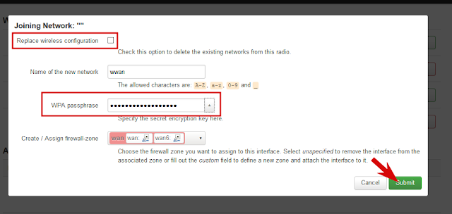 В следующем окне снять отметку «Replace wireless configuration» (если установлена) и ввести пароль от точки wifi телефона, нажать кнопку «submit»