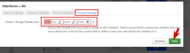 В следующем окне перейти на вкладку «Firewall Settings» и выбрать «Create / Assign firewall-zone» — wan (красным цветом), нажать «save»