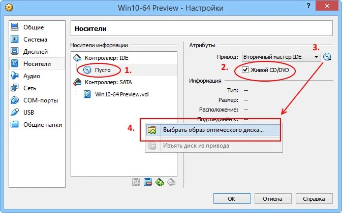 Также здесь присутствует виртуальный дисковод, подсоединим к нему образ с операционной системой Windows 10, которую мы скачали во вчерашней статье. В параметре «Носители» выбирайте «Привод» и «Выбрать образ оптического диска