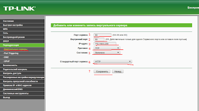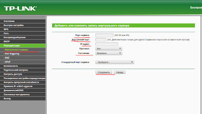 | Пример заполнения параметров настройки виртуального сервера TP-LINK |