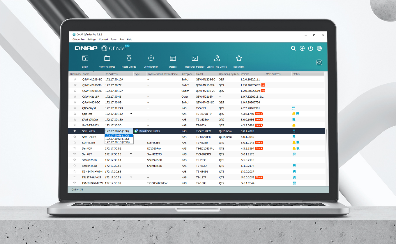 Qfinder Pro finds and displays all the QNAP NAS that are reachable on the same LAN, providing you with effortless centralized access and management. With Qfinder Pro, you can configure settings and monitor multiple QNAP NAS without logging into a web interface, providing you with greater convenience for everyday tasks.