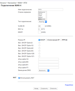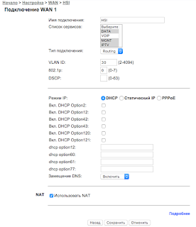 - Имя подключения вводим любое. В «Типе подключения» указываем «Routing», а из списка сервисов выбираем «DATA». VLAN ID – указываем из договора.