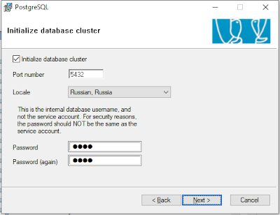Перейдем к следующему шагу и укажем Инициализировать кластер БД, порт 5432 и Кодировку UTF8