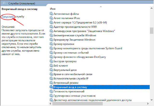 Для выполнения данного пункта должна быть запущена служба «Вторичный вход в систему» (secondary logon). Если он не запущен, его следует запустить в списке всех сервисов: