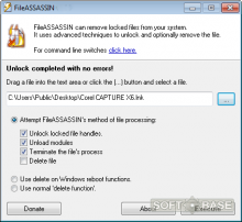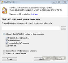 Это самое простое приложение в обзоре, разработанное еще в середине прошлого десятилетия. Тем не менее, оно отлично запускается даже на новых платформах (включая Windows 10). Принцип работы FileASSASSIN простой – выбираем в интерфейсе путь к искомому файлу и назначаем необходимое действие – просто разблокировка или снятие процесса плюс удаление. Есть возможность удаленной очистки объекта (после перезагрузки ОС).